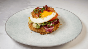 435 kcal Białko 25g/ Tłuszcze 25g/ Węglowodany 33g Domowy hash brown z pieczonych, całych ziemniaków, sadzone jajko, plastry grillowanego bekonu, pomidor, różne sałaty, młoda cebulka