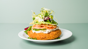 318 kcal Białko 15g/ Tłuszcze 18g/ Węglowodany 26g Domowy hash brown z pieczonych, całych ziemniaków , wędzony łosoś, awokado, ser typu Boursin, świeży ogórek, mix sałat, kiełki słonecznika, cebula dymka