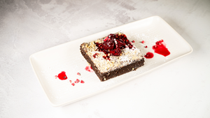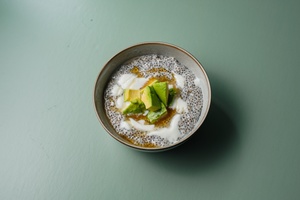 serwowany na zimno z awokado, odrobiną jogurtu i syropem klonowym