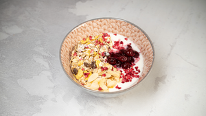 jogurt, musli tropikalne, konfitura z wiśni i suszone maliny