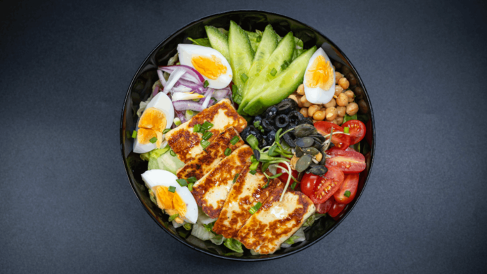 Grillowane Halloumi, mix sałat, pomidory koktailowe, ogórki, cieciorka, gotowane jajko, czerwona cebula, kiełki słonecznika, czarne oliwki oraz mix nasion. Z sosem jogurtowo - czosnkowym.